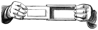 This trick may be performed by any of our readers without having the slightest introduction to the beings of another world. He has only to procure a small tube, place it in the valve-hole of the accordion, breath and blow into it alternately, and then by fingering the keys he will be able to produce precisely the same effect as our friends the mediums. In order to touch distant persons, or to make such things as guitars and tambourines play at different parts of the room, he has to conceal about him, or have hidden in some recess in the table or chair, a telescopic rod, extending several feet. To the end of this he fixes the tambourine or guitar, on the surface of which has554 been placed some phosphorus, and by waving the stick he makes it appear as if persons were floating over the heads of the company. The invisible hand is formed by a glove being fastened to the end of the tube. The glove is inflated or blown out through the tube, and when slapped on to the cheek of a person it has all the sensations of a cold hand striking the face. The glove covered with phosphorus and waved about is the mysterious hand, without any body, which caused so many to believe that a spirit was present.