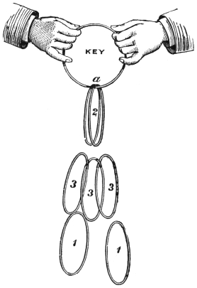 One of the tests offered by the mediums is the rope-tying trick, made so famous by the Davenport Brothers. It has been clearly demonstrated that it was merely a trick. The medium has in his hand a coil of rope about twelve yards long. The lights are extinguished, and a few seconds afterward, when the gas is lighted, he is seen securely fastened to a chair, his hands tied, and the rope made fast between his wrists. One of the company is requested to examine the rope and seal the ends of the knot. The gas is again extinguished, and a tambourine is heard bounding about the room. A hand—and a very material hand—claps the faces of the nearest persons, hats are knocked off, a bell is rung, arms are pinched, and various other manifestations occur which fully convince the astonished devotees that some one—spirit or otherwise—is evidently giving free vent to a playful and mischievous disposition. The medium, of course, claims that these manifestations are performed by spirits summoned by him; and he is believed, not because the spectators suppose that spirits could be so summoned and be made to manifest their presence, but that, because the medium is tied with a rope, the ends of which are so sealed as to prevent his getting free from the bondage into which553 the spirits have placed him, he cannot possibly be the one that played the tambourine, rung the bell, gave the blows, etc.—ergo, it must have been the spirits.