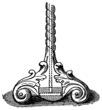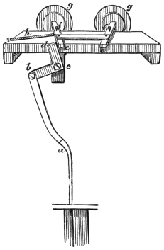 The floating table has often been performed, but I have never attempted to do this spiritual manifestation. The medium generally has with him an accomplice, and they bind to their arms a flat iron rod, which terminates toward the wrist in a kind of hook concealed from the company by the cuffs of the shirt. The medium contrives to slip this hook under the edge of the table, as does also his confederate who sits opposite, while the dupe is sitting between. The annexed illustration will show the iron rod, and the method of fitting it beneath the table.