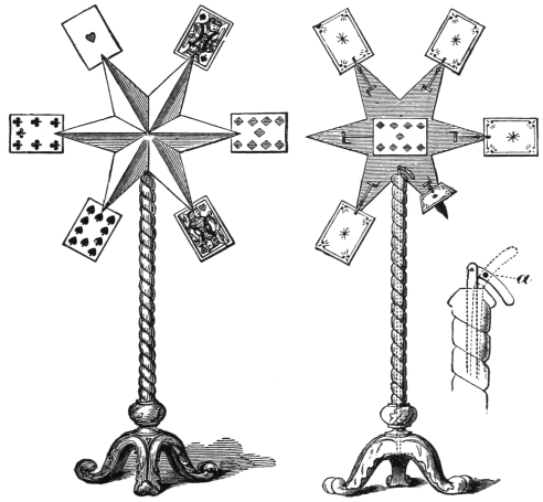 Three cards are selected from the pack by the company, then returned to it, and the pack is shuffled. The performer then takes it, and knocking it against the door or wall, the pack sticks up there, to the great surprise of the audience. Those of the company who chose the three cards are asked to name them, and as they do so they rise one by one from the pack. Price, $2.