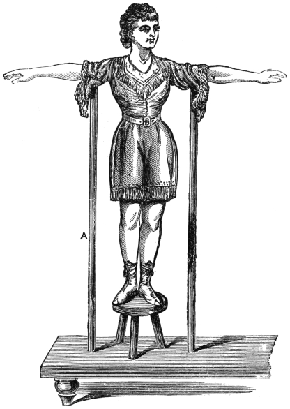The performer, taking in his hands a round black wand such as is used during the performance, about two feet long, makes it go through the most extraordinary performance. First he places the bar in the palm of his hand, and holding his hand up in perpendicular position, the bar is seen suspended without any support. The performer now places the bar to the extreme points of his fingers, and holds his arm in a horizontal position, when the bar is again seen suspended without any support in that most difficult position.