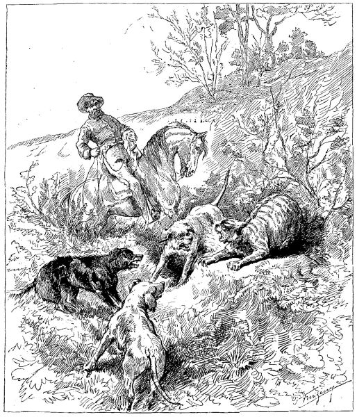 "Shame on you!" cried Captain Banner; "and three of you, too! At him, Turco; catch him by the throat, Poncho," he continued calling, while he prepared his lasso. But though, inspired by these encouragements, Turco, Poncho, and Red Jacket bayed and leaped up and about the lynx as if they would part company with their stout legs entirely, the great cat raised his thick paw and sputtered so savagely that all three beat a prudent retreat.