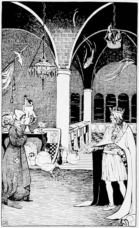 Just then Father Rhine appeared. Seeing his beloved wife quite well again, the river god beckoned to the nurse to follow him. He led her through many halls of the great castle. Finally they came to his[11] treasure chamber. Here all around lay great heaps of gold, silver, and precious stones.