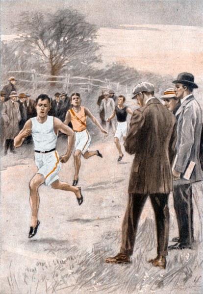 “There’s Gerald,” said Alf, pointing to a youngster who, in a modest attire of sleeveless shirt, short running trunks and spiked shoes, was stepping eagerly about at a little distance.[7] “Looks as though he could run, doesn’t he? Good muscles in those legs of his. That’s what boxing does for you.”