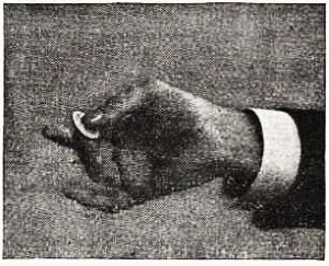 The beginner is apt to try to have his hand appear perfectly flat when seen from the back; but let him notice the open hand of a friend as it hangs in a normal condition, and he will find that it is slightly arched. Supposing that my reader is now an adept at palming, let us proceed with "The Miser" as Herrmann did it.