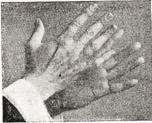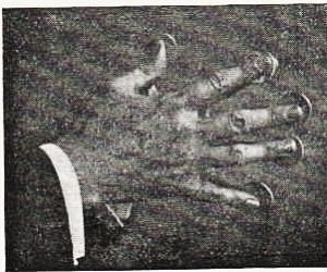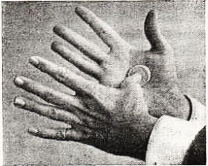 Begin by rolling up the sleeves so that the arms are bared. Hold the left-hand extended, palm upwards, and on the tip of each finger and thumb balance a coin. Place the right hand on top of the left, so that the money is held between the tips of the fingers of the two hands. Now turn the hands until the back of the right hand is towards the audience, as in Fig. 4. Fix your eyes on the ceiling, as if that had something to do with the trick; move the hands rapidly upward and downward twice, and while doing so bring the tips of the fingers together, causing the coins to lap one over another. Then surround them, as it were, with the tips of the left hand fingers and thumb, and quickly slide them down into the right palm, where they are to be held by pressing on them with the tip of the left thumb; finally, at almost the same moment make a third upward move, keeping the hands together and the eyes fixed above; the hands will appear to be empty and the coins to have vanished. Figs. 5 and 6 show the fronts and backs of the hands. During the applause which always follows this trick, quietly withdraw your thumb, close the right hand over the money, and put it noiselessly away, either in your pocket or other receptacle.