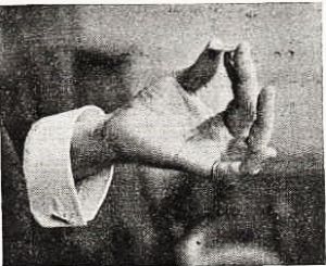 Approaching some man in the audience, he asked for a high hat, and as it was handed to him he thrust the left hand inside of it, the thumb only remaining outside to grasp the rim. Extending his arms, he struck the left arm with his wand and the closed right hand, asking the nearest person to feel his arms and body so as to assure himself that nothing was concealed there. This examination over, he turned to go back to the stage, throwing his wand ahead of him, and letting the coin in the right hand slip into his sleeve.
