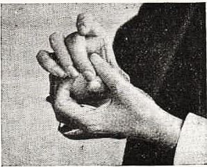 As it will be necessary for my readers first to master this important element of conjuring, I shall try to teach it before explaining the other details of the trick. To palm a coin, hold it lightly between the tips of the second and third fingers and the thumb of either hand, as shown in Fig. 1. Balancing it on the finger-tips, let the thumb resume its normal position, and at the same moment let the two fingers press the coin into the hollow of the palm. See Fig. 2. Now contract the thumb so that the coin will be held by the ball on one side, and on the other by the opposite fleshy part of the hand, as in Fig. 3. Though at first it may be difficult to press the coin into the exact position, practice will soon make it easy.