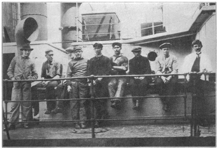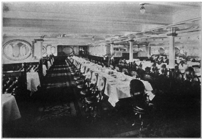 Fainter and fainter the crowd on the dock appeared to the passengers on board, until finally the dock itself was lost to view as the graceful vessel gained headway. Some of the passengers remained long at the ship’s rail, held by the fascination of the water, which seemed swiftly to approach, [Pg 15] and as swiftly to move away. Others, singly or in groups, left the rail to arrange their belongings in their staterooms, to inspect the magnificence of the vessel’s equipment, and to accustom themselves to their new surroundings.