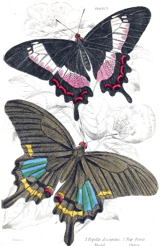 On the supposition that Drury’s figures accurately represent the insect as it appeared when alive, the only connexion which it has with Urania arises from the similar distribution of colours and neuration of the wings; in other respects it would be 206 classed with the Papiliones. But this anomaly is certainly a remarkable one, that it should combine clavate antennæ, with an arrangement of the alary nervures exactly corresponding to an insect with which in other respects it is so nearly identical. There being no other example of such a peculiarity, and the insect figured by Drury never having been found since, we are naturally led to suspect that he has been, in some way or other, under error. We have no doubt, however, that his figures afford a faithful representation of the specimen from which they were taken, as the drawings were made by Moses Harris, whose accuracy in such matters is well known. But there seems good reason to believe that the specimen in question has been originally defective, and that improper means have been taken to supply its deficiencies. By supposing that the head of a genuine papilio had been attached, in order to supply the want of that part in the specimen, and give it the appearance of being complete (a practice which has often been followed by amateur collectors), we get rid of the greatest objection to its being considered identical with Rhipheus. The want of the tails is easily accounted for, these appendages being so brittle when dry, that they are seldom preserved except in specimens which have received the utmost care. In other instances Drury has erroneously represented species as destitute of tails; we recollect in particular Satyrus Philoctetes. We mention these circumstances as affording means by which it is possible to account for the peculiarities 207 presented by Drury’s figure; but it is likely that different opinions will be held on the subject. The following are Mr. Swainson’s observations:—“If the imagination was taxed to invent, or to concentrate into one figure all that was splendid, lovely, or rare in the insect world, Nature would far exceed the poor invention of man by the production of this incomparably splendid creature; its rarity also is so great, that but one specimen has ever been seen. It is not, however, on this account only that we have been induced to copy this figure, but because its illustration will clear up one of the most intricate and perplexing questions that has hitherto impeded the natural arrangement of the Linnæan Papiliones, and even of the whole order of the Lepidoptera.