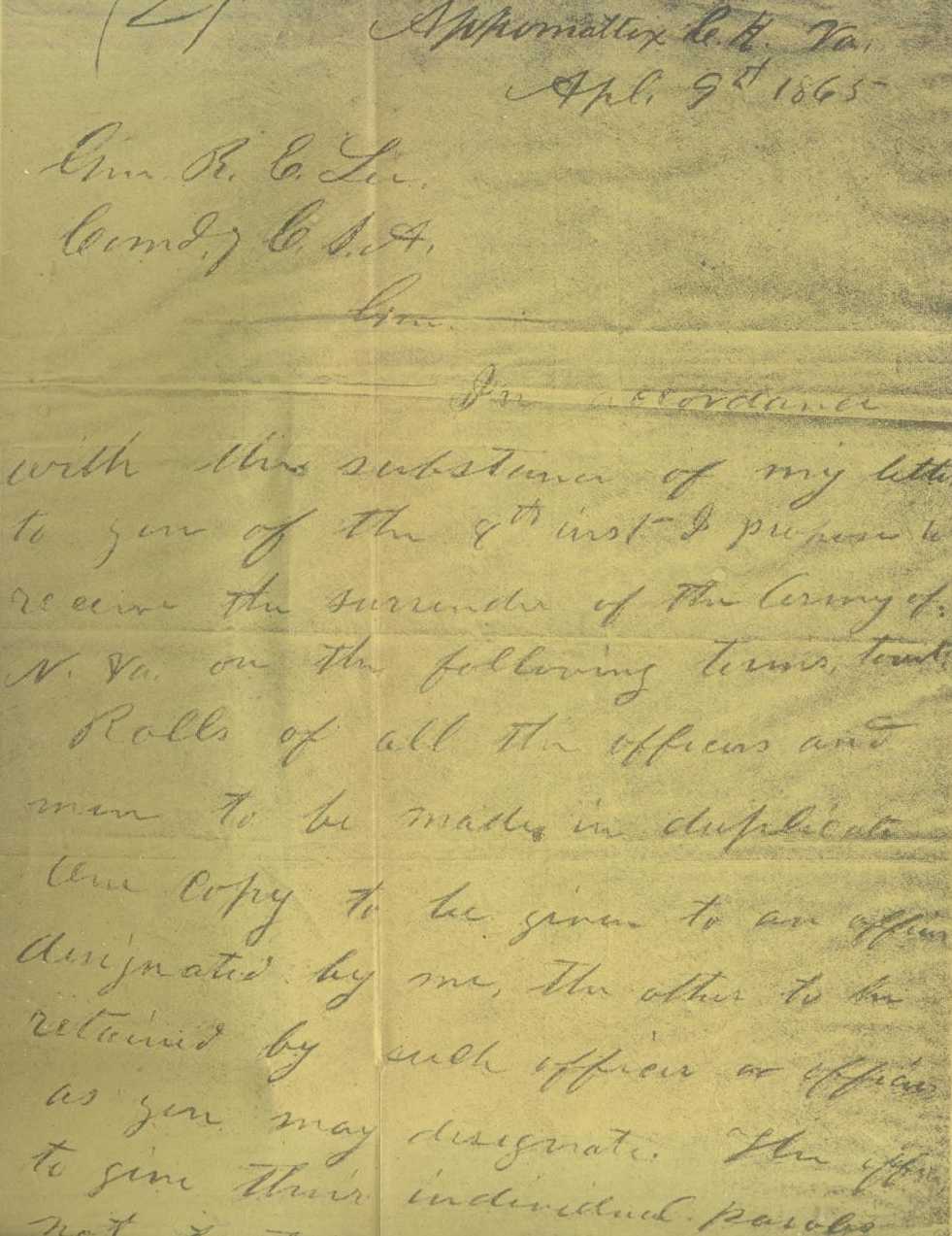 "GENERAL:—Your note of last evening, in reply to mine of same date, asking the condition on which I will accept the surrender of the Army of Northern Virginia, is just received. In reply, I would say, that peace being my great desire, there is but one condition I would insist upon—namely, That the men and officers surrendered shall be disqualified for taking up arms again against the Government of the United States until properly exchanged. I will meet you, or will designate officers to meet any officers you may name for the same purpose, at any point agreeable to you, for the purpose of arranging definitely the terms upon which the surrender of the Army of the Northern Virginia will be received.
