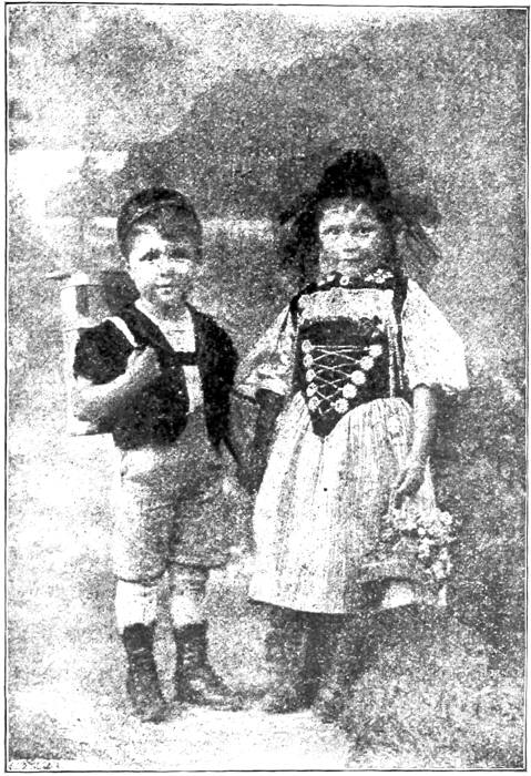 Hans has at last filled his pail and hurries back to the house, whose thatched roof is so low that it almost touches the ground. Gretchen has taken off her grandmother’s clothes and is busy helping the mother prepare supper. She is very proud of the fact that her pretty filagree chains and pins, together with her velvet bodice and delicate muslin waist, were worn by the dear old grandmother, on whose grave she lays fresh flowers every Sunday. By and by they all draw the straight wooden chairs to the table and the father says a simple prayer. Hans and Gretchen eat thankfully the black bread and creamy cheese which was made last summer up on the Alps high above them, where the snow flowers bloom and the winds blow cold from the glaciers.