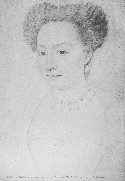 Elle fut portraite en ce temps environ, mais le crayon ne nous en fait pas une beauté. Elle a la figure allongée, les yeux intelligents, quelque chose de volontaire et d’absolu, un masque énergique en un mot. Nous ne saurions mettre un nom d’artiste sur cette œuvre enlevée de brio à l’estompe, puissamment comprise et légère cependant. C’est la besogne d’un crayonneur adroit, amoureux de son métier, une fine et définitive esquisse[41]. Mme de Carnavalet réservait-elle cette page à son amoureux reconnu, son cousin, Guillaume de Hautemer, sieur de Fervaques, depuis maréchal de France? En tout cas c’est dans cette liaison envahissante, dans cet amour qu’il faut chercher une explication aux refus de la dame sur le fait d’hyménée. D’Aubigné, qui haïssait Fervaques, et qui reportait sur Mme de Carnavalet un peu de ce ressentiment empreint de huguenoterie, qualifiait ces rapports d’incestueux. C’était aller un peu loin; Fervaques fut de cet avis, car il en demanda raison à l’autre.