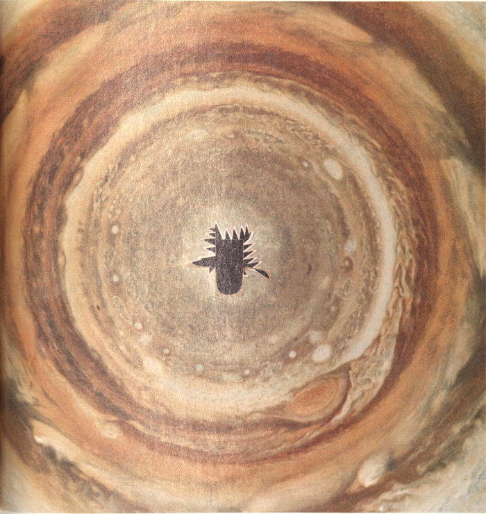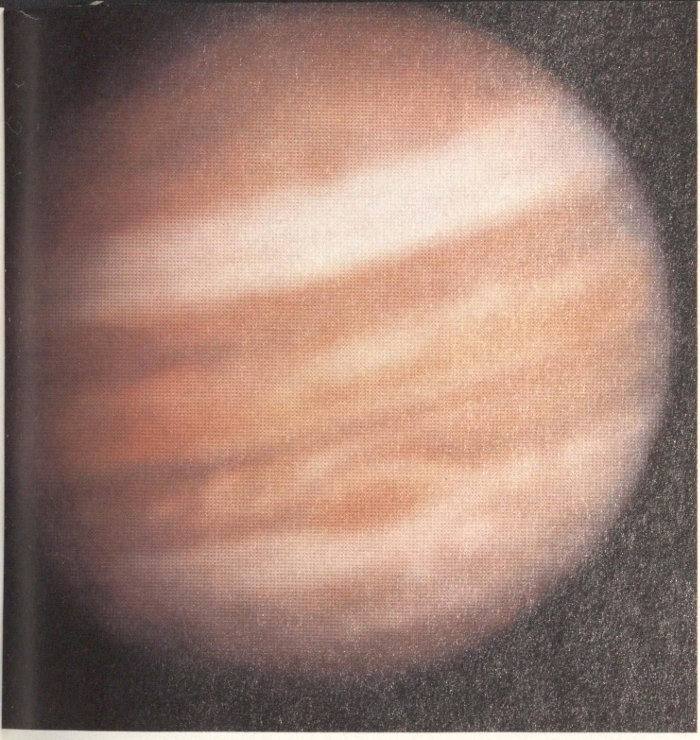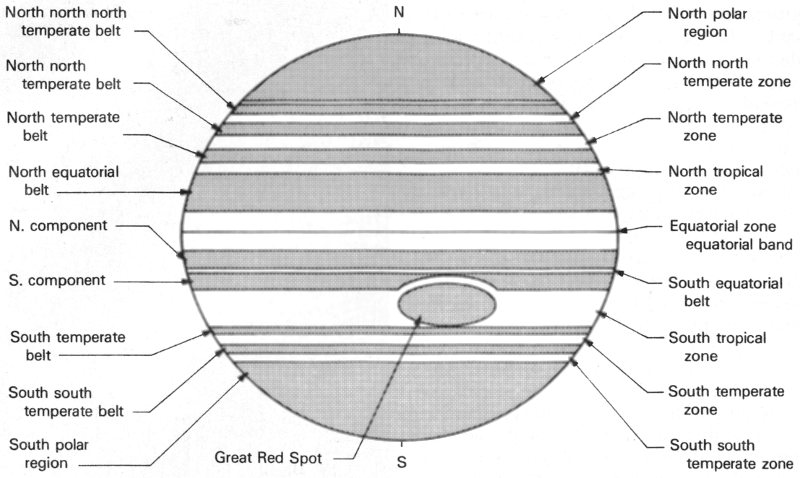 The major features of Jupiter are shown in schematic form. The planet is a banded disk of turbulent clouds; all its stripes are parallel to the bulging equator. Large dusky gray regions surround each pole. Darker gray or brown stripes called belts intermingle with lighter, yellow-white stripes called zones. Many of the belts and zones are permanent features that have been named. One feature of particular note is the Great Red Spot, an enigmatic oval larger than the planet Earth, which was first seen more than three centuries ago. During the years the spot has changed in size and color, and it escaped detection entirely for nearly fifty years in the 1700s. However, since the mid-nineteenth century the Great Red Spot has been the most prominent feature on the face of Jupiter. [2935]