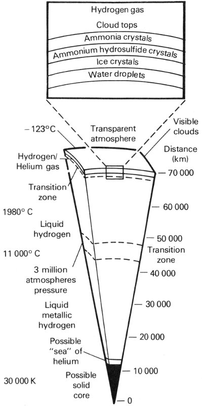 In the 1940s and 1950s the German-American astronomer Rupert Wildt used all the available data to derive a picture of Jupiter that is still generally accepted. He noted that both the low total density and the observed presence of hydrogen-rich compounds in the atmosphere were consistent with a bulk composition similar to that of the Sun and stars. This “cosmic composition” is dominated by the two simplest elements, hydrogen and helium, which together make up nearly 99 percent of all the material in the universe. Wildt hypothesized that the giant planets, because of their large size, had succeeded in retaining this primordial composition, whereas the hydrogen and helium had escaped from the smaller inner planets. He also used his knowledge of the properties of hydrogen and helium to calculate what the interior structure of Jupiter might be like, concluding that the planet is mostly liquid or gas. Wildt suggested that there probably was a core of solid material deep in the interior, but that much of Jupiter is fluid—extremely viscous and compressed deep below the visible atmosphere, but still not solid. The atmosphere seen from above is just the thin, topmost layer of an ocean of gases thousands of kilometers thick.