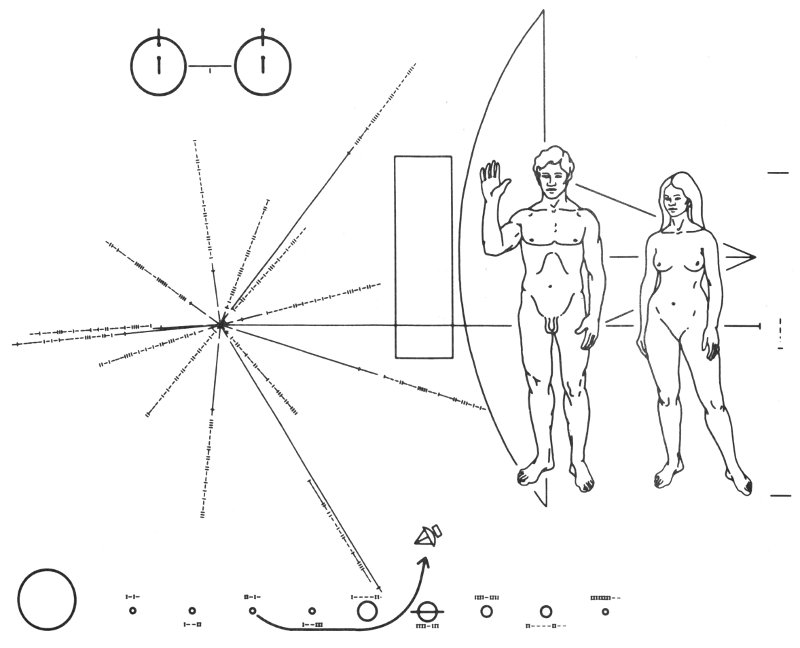 Pioneer 10 was the first human artifact launched with sufficient energy to escape the solar system entirely. Fittingly, the craft carried a message designed for any possible alien astronauts who might, in the distant future, find the derelict Pioneer in the vastness of interstellar space. A small plaque fastened to the spacecraft told the time and planet from which it had been launched, and carried a symbolic greeting from humanity to the cosmos.