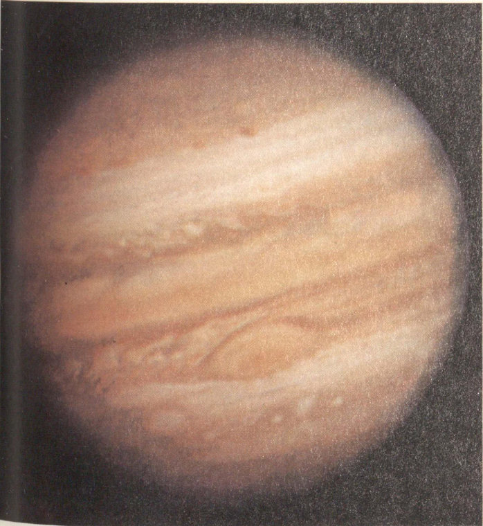 In the Sun’s necklace of planets, one gem far outshines the rest: Jupiter. Larger than all the other planets and satellites combined, Jupiter is a true giant. If intelligent beings exist on planets circling nearby stars, it is probable that Jupiter is the only member of our planetary system they can detect. They can see the Sun wobble in its motion with a twelve-year period as Jupiter circles it, pulling first one way, then the other with the powerful tug of its gravity. If astronomers on some distant worlds put telescopes in orbit above their atmospheres, they might even be able to detect the sunlight reflected from Jupiter. But all the other planets—including tiny inconspicuous Earth—would be hopelessly lost in the glare of our star, the Sun.