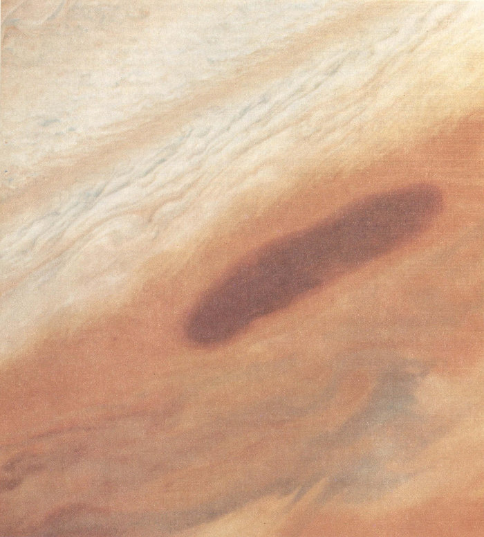 Although the face of Jupiter is always changing, some spots and other cloud features survive for years at a time, much longer than do the largest storms on Earth. The record for longevity goes to the Great Red Spot. This gigantic red oval, larger than the planet Earth, was first seen more than three centuries ago. From decade to decade it has changed in size and color, and for nearly fifty years in the late eighteenth century no sightings were reported, but since about 1840 the Great Red Spot has been the most prominent feature on the disk of Jupiter.