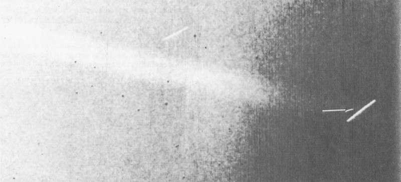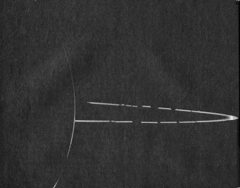This image of Io’s extended sodium cloud was taken February 19, 1977, at the Jet Propulsion Laboratory’s Table Mountain Observatory. A picture of Jupiter, drawings of the orbital geometry, and Io’s disk (the small circle on the left) are included for perspective. The sodium cloud image has been processed for removal of sky background, instrumental effects, and the like. This photograph demonstrates that the cloud is highly elongated and that more sodium precedes Io in its orbit than trails it. [P-20047]