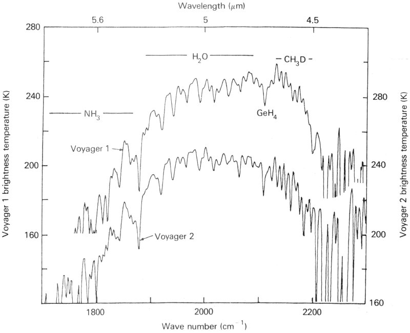 Although the presence of a gas can usually be inferred from spectroscopy, solids or liquids cannot normally be detected in this way. Thus the composition of Jupiter’s clouds could not be determined directly. However, the presence of ammonia gas provided an important clue. At the temperatures expected in the upper atmosphere of the planet, ammonia gas must freeze to form tiny crystals of ammonia ice, just as water vapor in the Earth’s atmosphere freezes to form cirrus clouds. Most investigators agreed that the high clouds covering much of Jupiter must be ammonia cirrus. But ammonia crystals are white, so the presence of this material provides no explanation for the many colors seen on Jupiter. Additional materials must be present—perhaps colored organic compounds, produced in small amounts by the action of sunlight on the atmosphere.