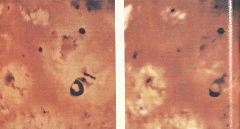 These blue filter photographs of Jupiter were taken at Mauna Kea Observatory, Hawaii. They show changes on Jupiter’s surface between 1973 and 1978, with the dates of the observations.