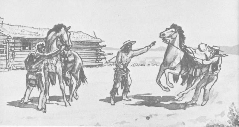 Changing mounts at Pony Express Station. Original sketch in Oregon Trail Museum.