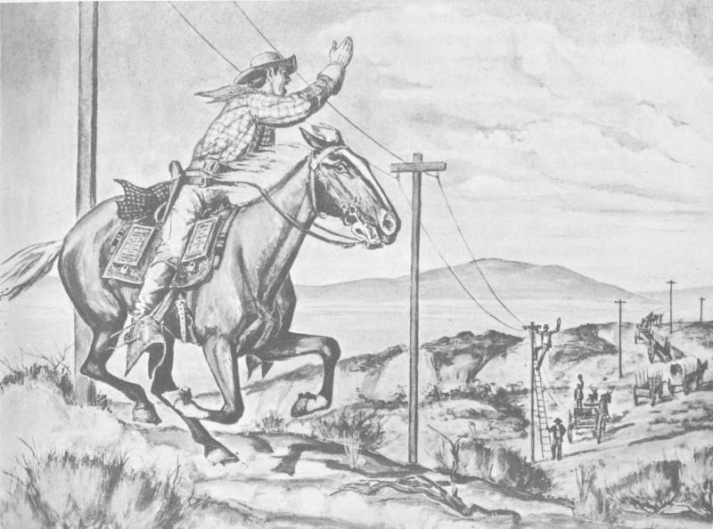 Pony Express rider and the advancing telegraph. Original sketch in Oregon Trail Museum.