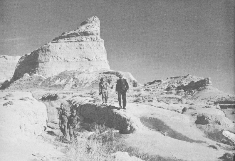 The Badlands regions of western Nebraska and South Dakota have become world famous for their extensive deposits of fossils of mammals and other animals that lived during the Oligocene and Miocene Epochs of the Cenozoic Era. The Brule clay formation of Scotts Bluff and vicinity is particularly rich in fossil remains of extinct animals of Oligocene age, 30 to 40 million years ago. These exposed remains gave rise to many Indian legends and were frequently noted by curious emigrants. Scientists from many institutions of learning have continued to explore and examine these fossils since 1847, when Dr. Hiram Prout of St. Louis described a jawbone brought to him by a fur trader as that of a Titanothere, a giant rhinoceros-like creature.