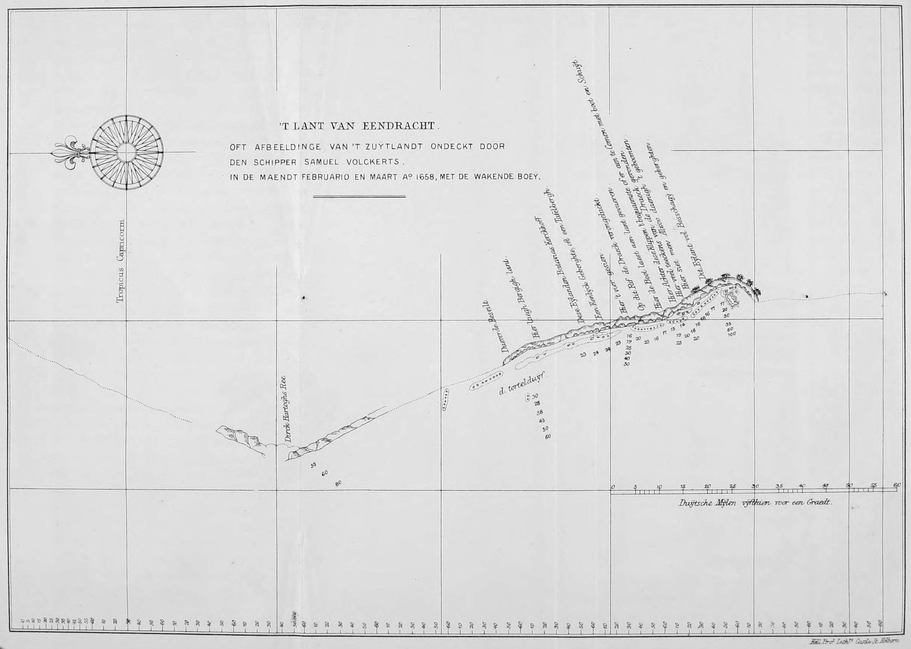1008But yet, again, it may be objected that a country so vaguely and incorrectly laid down may not have been Australia. The answer is equally as indisputable as that which fixes the date. Immediately below the legend in question is another to the following effect: “Terra descuberta pelos Holandeses a que chamaraō, Enduacht, (sic) au Cōcordia” (land discovered by the Dutch, which they called Endracht or Concord). Eendraghtsland, as we all know, was the name given to a large tract on the western coast of Australia, discovered by the Dutch ship the Eendraght, in 1616.