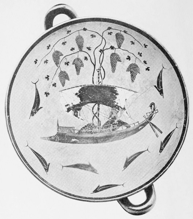 The popular belief in antiquity in the human intelligence of dolphins and their kindly feeling toward man was explained by the ancient writers in the light of the transformation of the Tyrrhenian pirates into dolphins. (See Lucian, Marine Dialogues, 8; Oppian, Halieutica, I, 649-654, 1098, V, 422, 519f; Porphyry, De Abstinentia, III, 16.) As Oppian (I, 1089) in his Halieutica has it, in William Diaper’s charming translation: