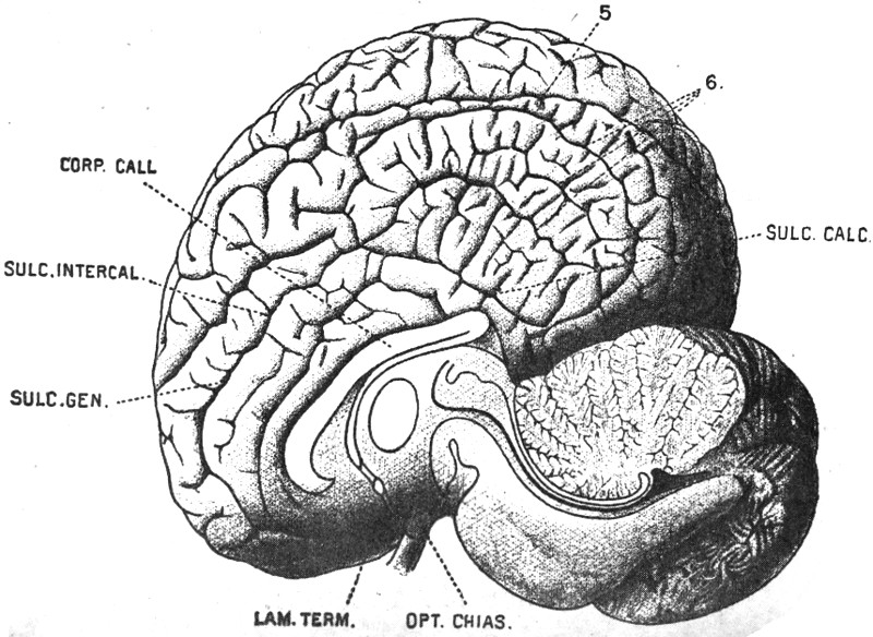 “The marvelous complexity of the surface of the cerebrum is the direct result of its great size. In order, apparently, that the cerebral cortex may be efficiently nourished and at the same time be spared to as great a degree as possible the risk of vascular disturbances [such as would be produced by large vessels passing into it], its thickness does not appreciably increase in large animals. [He then quotes Dubois’ figures showing that the whale’s cortex is the same thickness as that of the human.] Such being the case, it naturally results that the increased bulk of cortex in large animals can only be packed by becoming thrown into increasing number of folds, separated by corresponding large number of sulci.”[4]