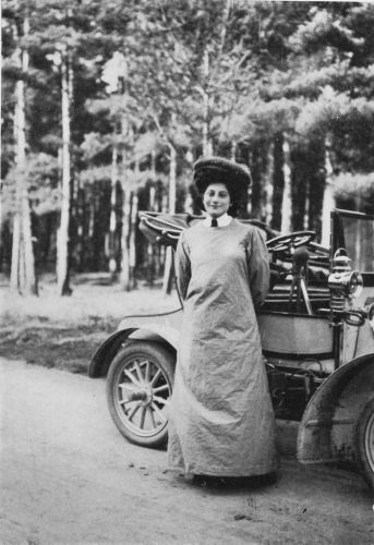 An all-important question is dress. Automobilists are nowadays more careful in the choice of their attire, but there are still a goodly number who seem to imagine it is impossible to look anything but hideous when in an automobile. On a closed-in car, limousine or landaulette, any kind of attire is permissible as the conditions are precisely the same as being driven in a carriage, but with an open car neatness and comfort are essential. When racing, or when in countries where speed is not looked upon with such horror as in England{24}—on the long, straight seemingly never-ending, military roads of France, one can travel at a speed that makes goggles or masks a necessity, but for motoring under ordinary conditions there is no reason why one should wear them. It might be borne in mind that I am writing this book for the woman who is desirous of being her own driver and owning her own car; yet perhaps my advice will be applicable to the whole sex. I average about 400 miles per week—in all conditions of weather—all sorts of cars and all sorts of places, and therefore speak from experience—in many instances dearly bought.