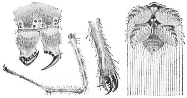Wir drehten sie auf den Rücken und sahen am Ende des Hinterleibes eine Anzahl kleiner Warzen, aus welchen sie die seidenen Fäden zieht, die aus kleinen Röhrchen kommen. Sie zieht die Fäden durch die Kämme an ihren Beinen, und so spinnt sie ihr Gewebe, während sie dahinläuft.