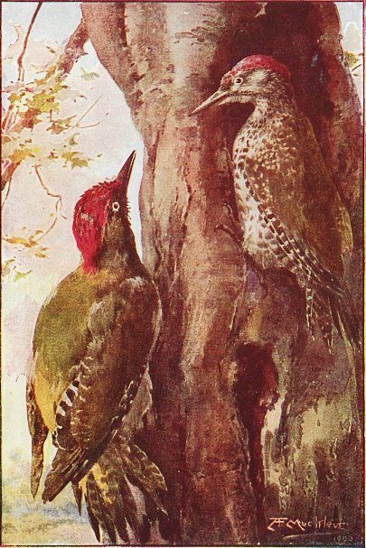 Endlich sahen wir eines Tages, wie die alten Spechte Insekten in das Loch trugen. Nach einiger Zeit sahen wir die Jungen außerhalb des Loches auf dem Baume. Sie konnten noch nicht fliegen, aber sie liefen an den Zweigen entlang und hüpften so spaßig mit ihren steifen Schwänzen.