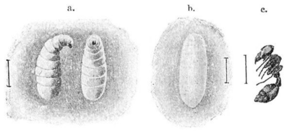 a. Ameisenlarve. b. Kokon der Ameise. c. Junge Ameise.