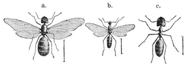 a. Weibliche Ameise. b. Männliche Ameise. c. Arbeiterin.