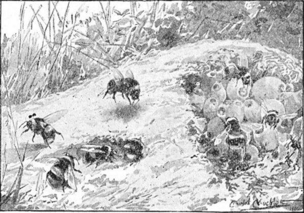 Viele Hummeln schwärmten ein und aus. Alle diese waren aus den Eiern ausgekrochen, die das Hummelweibchen in zwei Monaten gelegt hatte. Sie waren sehr geschäftig, um Honig und „Bienenbrot“ für die Larven herbeizutragen. Aber sie speichern, wie Paul sagt, keinen Honig auf wie unsere Bienen. Denn wenn kaltes, feuchtes Wetter einsetzt, sterben sie alle, mit Ausnahme einiger Hummelweibchen. Diese kriechen in Erdlöcher oder in warme Heuhaufen und schlafen, bis der Frühling wiederkehrt.