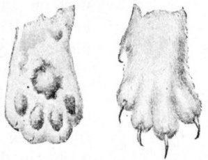 Wir alle wissen, was für scharfe Krallen sie an ihren Zehen hat. Aber wenn sie mit ihren Kleinen oder mit Peter spielt, ist ihre Pfote so weich, daß man gar nicht glauben kann, sie könne kratzen. Dies kommt daher, weil sie eine Rinne in jedem Zeh unter der Haut hat, und wenn sie ihre Krallen nicht braucht, zieht sie dieselben in jene Scheide zurück.