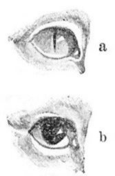 Aber wie kann sie bei Nacht Ratten und Mäuse sehen? Paul zeigte uns, daß sie die Mitte des Auges sehr weit im Dunkeln öffnen kann. Wir brachten Miezchen nahe an die Lampe und sahen, daß die Pupille ihres Auges nur ein kleiner schmaler Schlitz war. Darauf schlossen wir sie einige Minuten lang in einem dunkeln Zimmer ein, holten sie dann heraus und betrachteten ihre Augen bei Mondenschein. Jetzt war der kleine Schlitz ein großes, rundes, schwarzes Loch geworden.