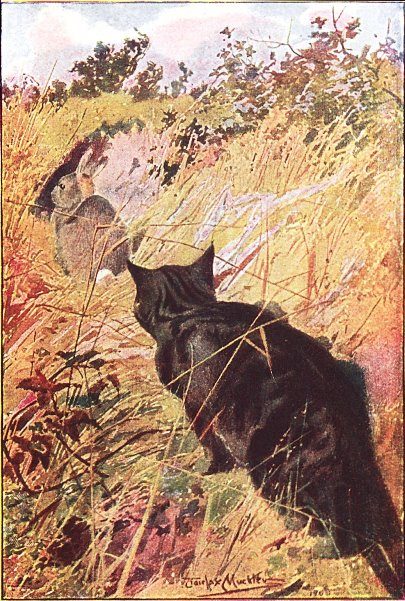 Aber Peter kann sie nicht zu Hause halten. Sobald es dämmerig wird, schleicht sie sich hinaus und kommt oft die ganze Nacht nicht nach Hause. Sie geht in der Dämmerung, weil dann alle Tiere fressen. So kann sie Mäuse und junge Kaninchen fangen, ebenso Rebhühner, die auf dem Boden, und andere Vögel, die auf den Bäumen schlafen.