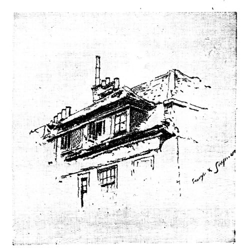 The charming way in which the few remaining rooms—all that are left—open off the landing, is another of the attractions of this gem, about whose future one feels a little anxious. There is no doubt it is in a precarious state, if not rickety, and is unsuited for the requirements of the school which is carried on there. The landing might be a room itself, so airily is it treated; quite in keeping, too, is the view from the windows, original in its way, unsuspected perhaps by those familiar with the ordinary aspect of the old Abbey; for there rises before us the grim old and much-neglected flank of the fane, with its mouldering buttresses and decayed windows, which the restorers have, fortunately, not thought worthy of their attention, as being too retired to meet the public eye. Some judicious restoring, cleaning, and repairing might be expended on the old house, which has an air of slight dilapidation. The present general tone of white certainly adds to the effect of lightness, and it is questionable whether the effect would be improved by exposing the old oak panelling.