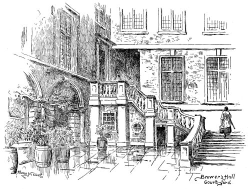 the way of antique survival. Yet here we come on at least three interesting old edifices—almshouses and schools—which in their aspect and surroundings offer a charming sort of surprise. Passing out of Victoria Street, where there is much crush and noise at “The Stores,” and down a small alley, we come to a little gem of its kind, as it will seem to the true artist, a small charity school, standing in its walled inclosure. It is of Queen Anne date and pattern, and is no more than a simple square little hall. But how quaint and varied is it! how admirably are its surfaces broken! while every side offers a different pattern. The honest brick is of a fine plum colour; the wall is daintily divided by pilasters; delicate, unobtrusive cornices run around; the windows are shaped in proportion, and the four doorways are of such varied elegance that it is difficult to decide between them. The whole approach in front, the gateway and its piers, iron work, the flight of steps, the door itself—all strike one as being the work of a tasteful artist. Over the door is the pleasantly rococo figure of “The Blew Coat Boy” in his niche. There is a little garden behind, with steps leading down, and a sort of dédendance attached, similar in style, but acting as a kind of foil. There is a charm about the little unpretentious building that is extraordinary. Unhappily it needs repair and restoration, though it is not{20} dilapidated. No one, however, seems to care for it, and a builder has been allowed to construct a sort of “lean to shed” beside it. By-and-by it is likely enough to pass away and to be swept off so coveted a piece of ground. All who appreciate the grace and charm of architecture must admire it.