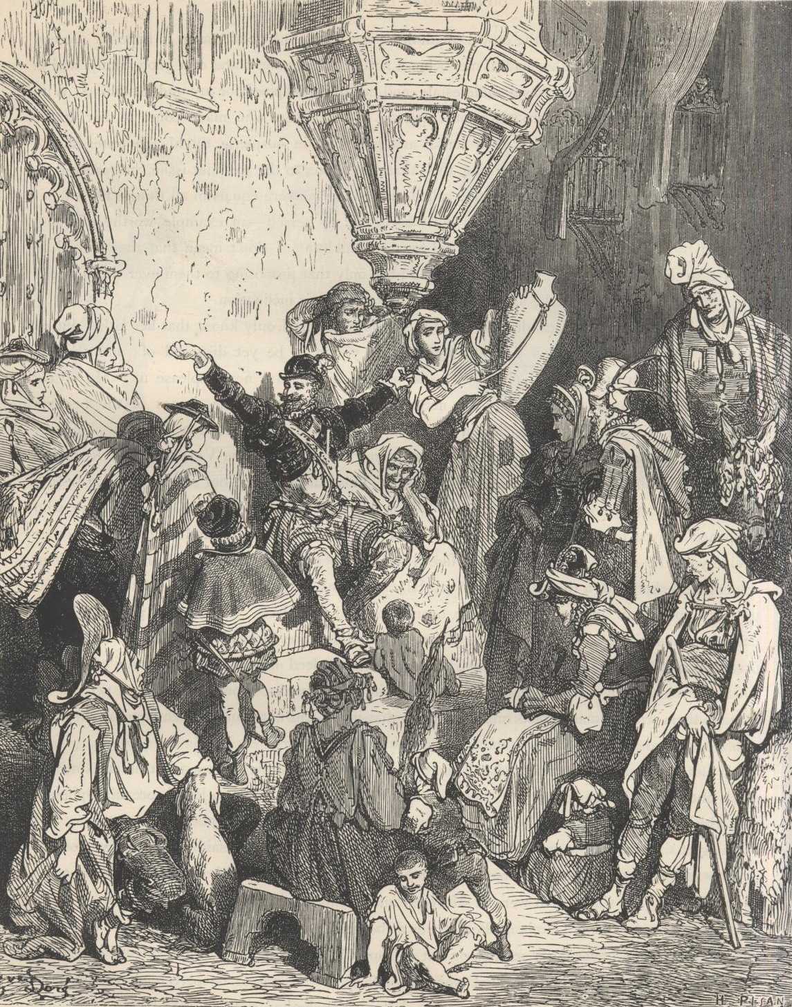 The book cover and spine above and the images which follow were not part of the original Ormsby translation—they are taken from the 1880 edition of J. W. Clark, illustrated by Gustave Dore. Clark in his edition states that, "The English text of 'Don Quixote' adopted in this edition is that of Jarvis, with occasional corrections from Motteaux." See in the introduction below John Ormsby's critique of both the Jarvis and Motteaux translations. It has been elected in the present Project Gutenberg edition to attach the famous engravings of Gustave Dore to the Ormsby translation instead of the Jarvis/Motteaux. The detail of many of the Dore engravings can be fully appreciated only by utilizing the "Enlarge" button to expand them to their original dimensions. Ormsby in his Preface has criticized the fanciful nature of Dore's illustrations; others feel these woodcuts and steel engravings well match Quixote's dreams. D.W.