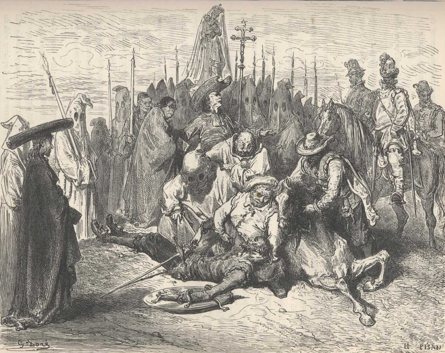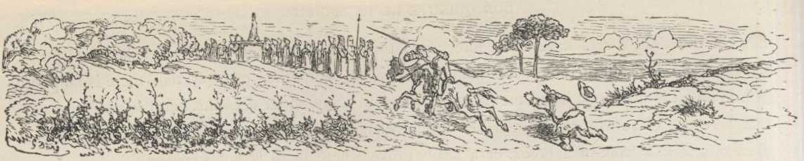 The fact was that the clouds had that year withheld their moisture from the earth, and in all the villages of the district they were organising processions, rogations, and penances, imploring God to open the hands of his mercy and send the rain; and to this end the people of a village that was hard by were going in procession to a holy hermitage there was on one side of that valley. Don Quixote when he saw the strange garb of the penitents, without reflecting how often he had seen it before, took it into his head that this was a case of adventure, and that it fell to him alone as a knight-errant to engage in it; and he was all the more confirmed in this notion, by the idea that an image draped in black they had with them was some illustrious lady that these villains and discourteous thieves were carrying off by force. As soon as this occurred to him he ran with all speed to Rocinante who was grazing at large, and taking the bridle and the buckler from the saddle-bow, he had him bridled in an instant, and calling to Sancho for his sword he mounted Rocinante, braced his buckler on his arm, and in a loud voice exclaimed to those who stood by, "Now, noble company, ye shall see how important it is that there should be knights in the world professing the of knight-errantry; now, I say, ye shall see, by the deliverance of that worthy lady who is borne captive there, whether knights-errant deserve to be held in estimation," and so saying he brought his legs to bear on Rocinante—for he had no spurs—and at a full canter (for in all this veracious history we never read of Rocinante fairly galloping) set off to encounter the penitents, though the curate, the canon, and the barber ran to prevent him. But it was out of their power, nor did he even stop for the shouts of Sancho calling after him, "Where are you going, Senor Don Quixote? What devils have possessed you to set you on against our Catholic faith? Plague take me! mind, that is a procession of penitents, and the lady they are carrying on that stand there is the blessed image of the immaculate Virgin. Take care what you are doing, senor, for this time it may be safely said you don't know what you are about." Sancho laboured in vain, for his master was so bent on coming to quarters with these sheeted figures and releasing the lady in black that he did not hear a word; and even had he heard, he would not have turned back if the king had ordered him. He came up with the procession and reined in Rocinante, who was already anxious enough to slacken speed a little, and in a hoarse, excited voice he exclaimed, "You who hide your faces, perhaps because you are not good subjects, pay attention and listen to what I am about to say to you." The first to halt were those who were carrying the image, and one of the four ecclesiastics who were chanting the Litany, struck by the strange figure of Don Quixote, the leanness of Rocinante, and the other ludicrous peculiarities he observed, said in reply to him, "Brother, if you have anything to say to us say it quickly, for these brethren are whipping themselves, and we cannot stop, nor is it reasonable we should stop to hear anything, unless indeed it is short enough to be said in two words."