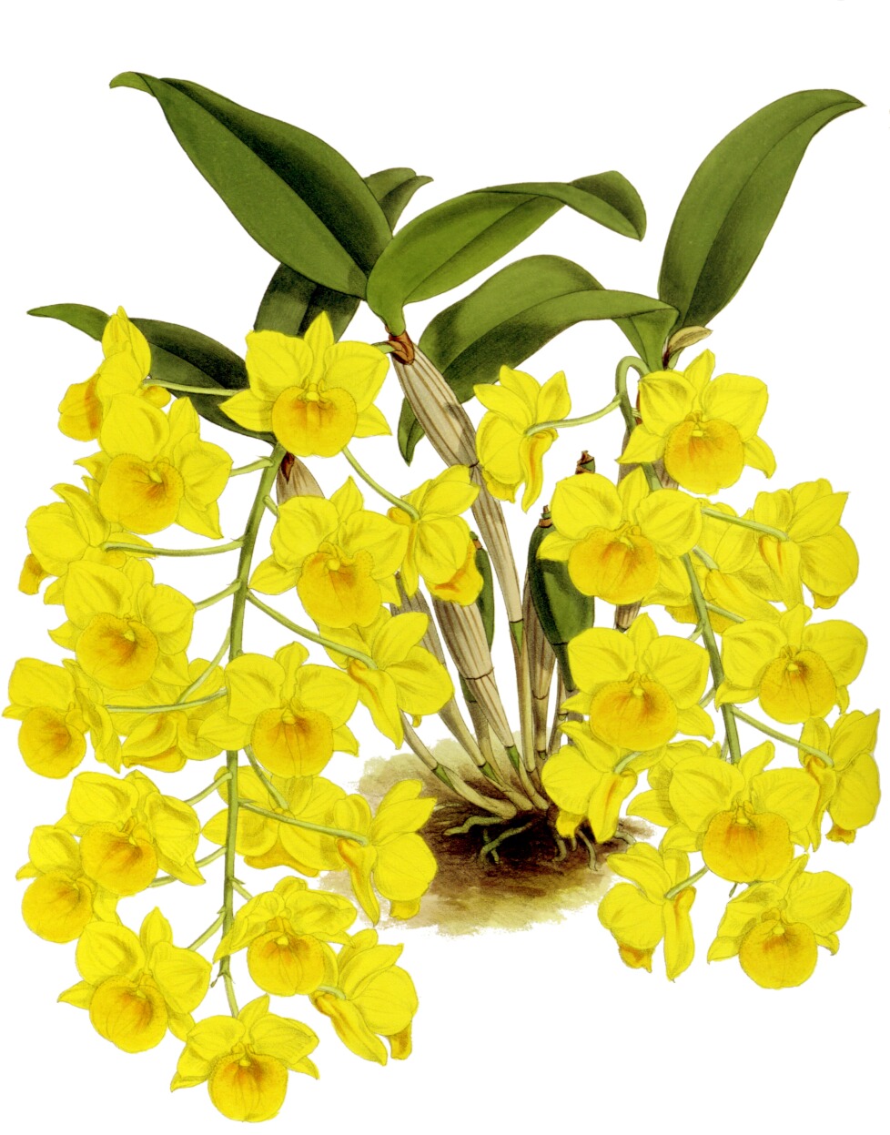 Dendrobium Farmerii aureum is a compact evergreen species from Moulmein. It grows about ten inches high, with dark green shining foliage. The flower spikes proceed from the top of the old bulb stems, and are sometimes ten inches in length. The sepals and petals are bright golden yellow, and the lip rich orange. The plant blooms during March, April, and May, and lasts about a fortnight in perfection.