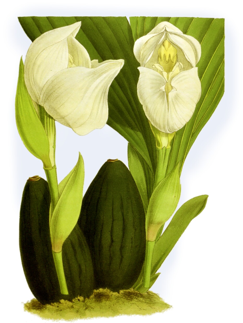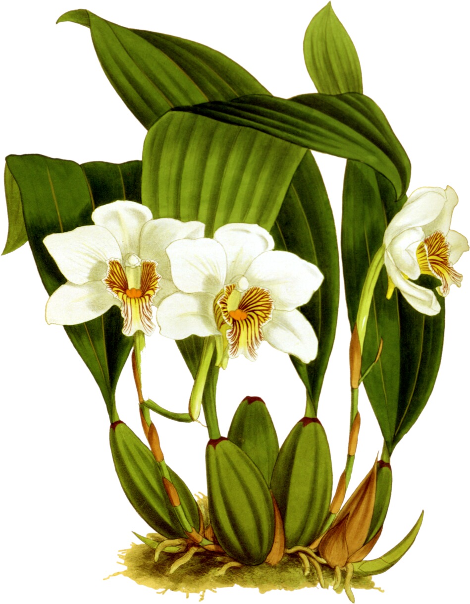 Of our present subject Dr. Lindley remarks (Folia Orchidacea, l. c.)—“This is, perhaps, the finest of this fine genus. The coriaceous leaves are more than fifteen inches long; the scapes are erect, very stiff, as long as the leaves, and furnished at the apex with an imbricated sheath of bud scales, out of which appears a flexuous raceme four to six inches long, composed of very large blunt deciduous bracts. The flowers are fully two inches and at half in diameter, pure white, except very long hairy fringes which are brown at their base, where they border the lip, and wholly brown where they cover the veins, and form three shaggy crests.” The only figure previously published is a very indifferent one of Griffith’s quoted above.