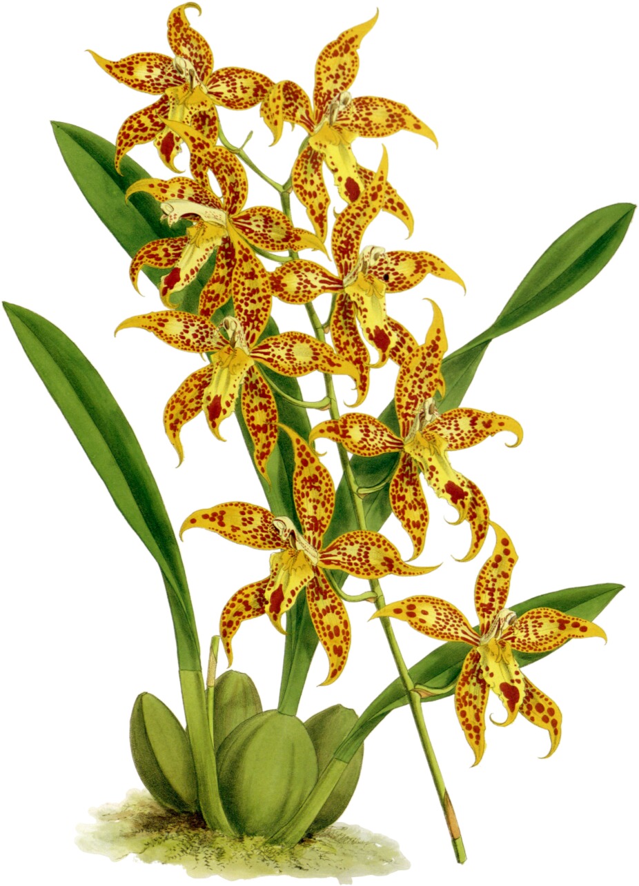 Epiphytal. Pseudobulbs ovate obtuse, nearly two inches long, pea-green, compressed, diphyllous. Leaves oblong-ligulate, acute, channelled towards the base. Scape radical, produced in the axil of a leaf investing the base of the pseudobulb, and terminating in an erect many-flowered raceme, furnished with small ovate bracts at the base of the pedicels, and having a few more elongated bracts below. Flowers stellate, about three and a half inches across, handsomely spotted; sepals slightly wavy, lanceolate, attenuately acuminate, narrowed to the base, clear bright yellow, deeper at the tips, dotted all over with rather small brownish crimson spots, which are here and there somewhat larger, those towards the apical part being less crowded by the smaller spots, the dorsal sepal with three red lines at the base; petals similar in form and colour, the larger less crowded spots being more evident, and the base marked by three lines of red; lip ovate-lanceolate, about two-thirds the length of the sepals, attenuated at the apex, bright yellow, deeper at the base, where there are a few red streaks, and with a large brownish crimson blotch towards the front, and a few marginal spots, the disk appressed to the column at the base, and bearing a thick linear keel, which extends into two rhomboidal toothletted lamellæ. Column sulphur-yellow, with a few reddish-brown spots, and a pair of falcate subulate ears or wings at the apex.