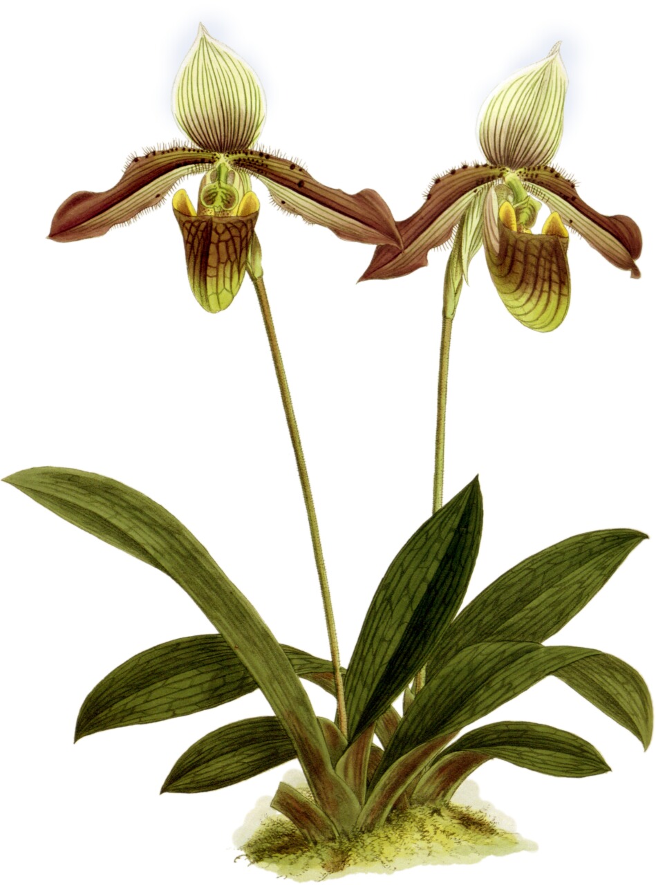 Epiphytal. Acaulescent. Leaves spreading, tufted, ensiform, channelled especially towards the base, tapered to the apex, one and a quarter inch wide, green. Scape of a brownish-red colour, tall, branched, bearing several flowers, with longish ovate-lanceolate boat-shaped bracts at the ramifications. Flowers large and handsome, five inches in lateral, three and a half inches in vertical expansion; dorsal sepal oblong ovate bluntish, pale watery green with several longitudinal purplish and darker green intermediate ribs, slightly flushed with red, the purple tint stronger on the glossy exterior, which is olive green, the extreme edge white; lower sepal broad ovate, half as long as the lip; petals two and a half inches long, over half an inch broad at the base, narrowing to the apex, pale greenish white in the centre with an edge of wine-red one-eighth of an inch wide which meets towards the end so that the apex is wholly wine-red, the colour deeper and glossy outside with the central parts olive, the inside covered over with pellucid hairs, those on the lower half near the base longer and purplish; lip bold, oblong obtuse, nearly two inches long, the pouch deep wine-purple in front, paler behind, the sides deeply inflexed and with a roundish projecting lobe at the front angle of the aperture, greenish or creamy white with a few irregular purple spots, the inside of the pouch more distinctly spotted. Staminode greenish white clothed with short stiff hairs, transversely oblong or reniform with an apiculus and having a fringe of short dark purple hairs on the front margin, the sterile lobe roundish, fleshy, greenish white, hairy.