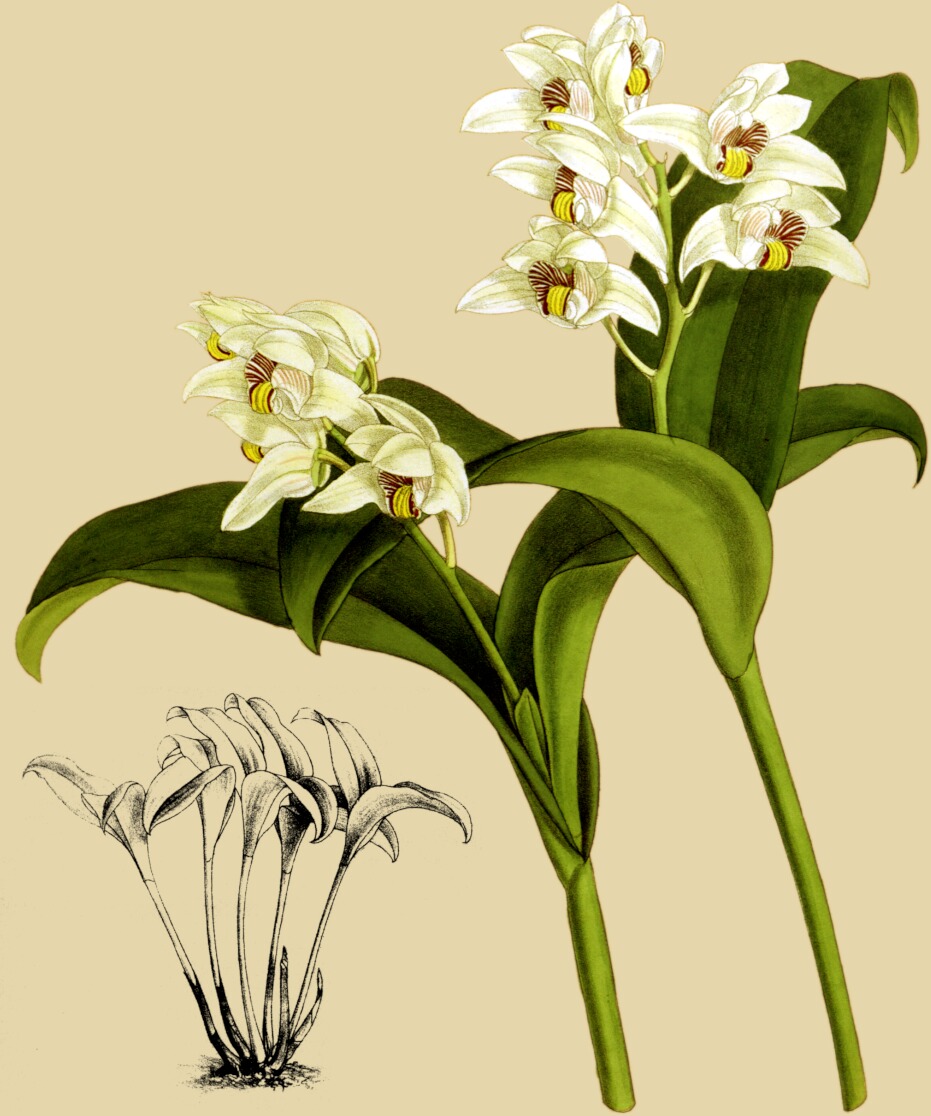 Dendrobium eburneum, Parish MS.; Bateman, in Botanical Magazine, t. 5459; Id., Second Century of Orchidaceous Plants, t. 166; André, Revue Horticole, 1883, 132, with coloured plate.