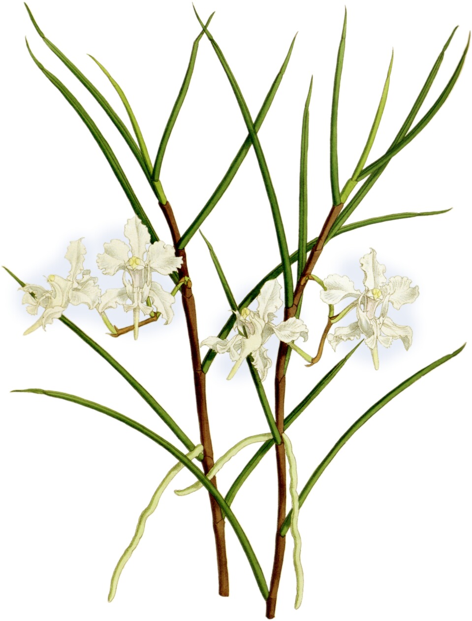 The plant we now introduce to the notice of our readers is very distinct from the ordinary types of Orchids, and is remarkable for its reed-like stems, and its very charming and beautiful blossoms. Its habit is to keep flowering in succession for a long period. When better known it will be much sought after; at present there are but few plants in cultivation, at least very few have come under our notice. There exist several varieties which vary in the colouring of their flowers; that which we now figure being a very good type. We are indebted to T. D. Cunningham Graham, Esq., Dunlop House, Stewarton, Ayrshire, for his kindness in sending the specimens for the use of our artist. A description of the Orchids at Dunlop House will be found under plate 118 of our present volume.